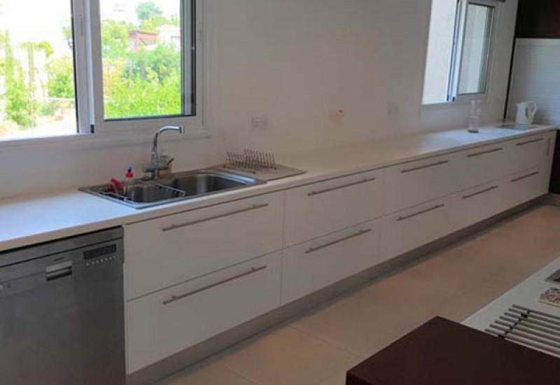 Contemporary bespoke kitchen, designed to be practical with an abundance of storage cupboards and encompassing all culinary needs.