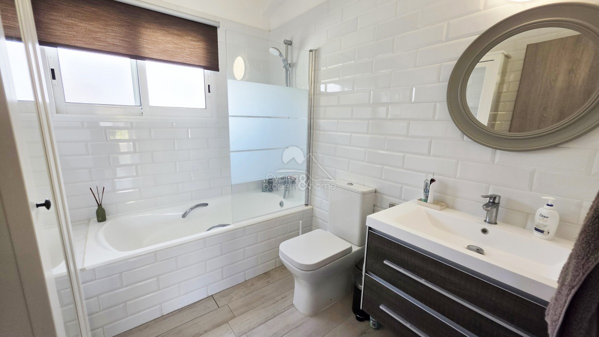 The upper floor comprises three double bedrooms, including a master suite with an en-suite bathroom and a shared balcony that enjoys scenic mountain views. Each bedroom is fitted with sleek sliding wardrobes and laminate flooring. The third bedroom benefits from a private balcony, while the modern family bathroom includes both a bath and a separate shower.