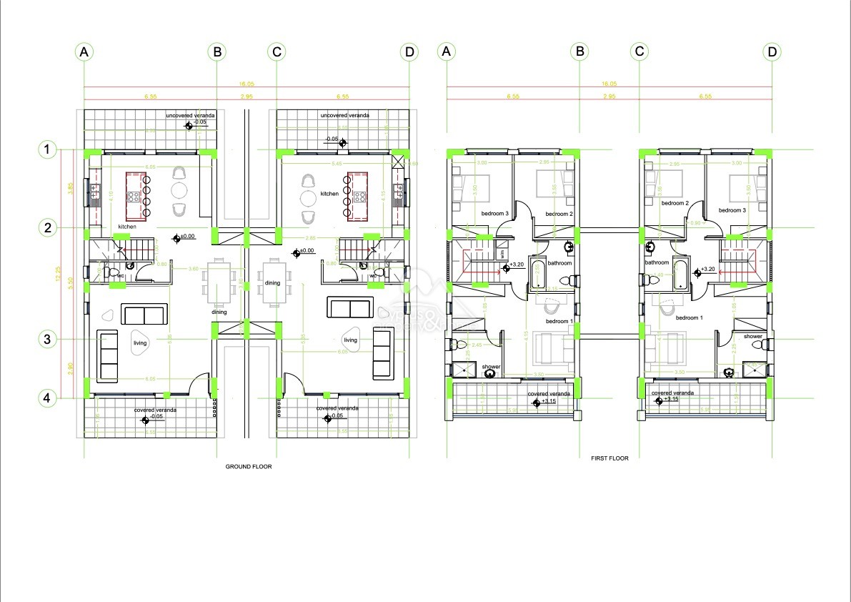 The semi-detached villas are arranged over two floors and offer a well-balanced family layout. The ground floor features a bright open-plan living and dining area, a modern kitchen, and a guest WC, with both covered and uncovered verandas extending the living space outdoors. Upstairs, the layout includes three bedrooms, with bedroom 1 benefiting from an en-suite shower, while the other two bedrooms are served by a main family bathroom. Covered verandas on the upper level further enhance the practicality and lifestyle appeal of the design.