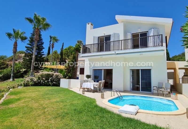 This gorgeous villa is on three levels located in a private cul-de-sac of seafront properties in the prestigious Coral Bay. Entering the living area you are immediately greeted by the jaw dropping sea views which are invited in through two sets of patio doors framing the stunning view of Potima Bay. The ground floor consists of an open plan living area with a modern and sleek white kitchen with built in appliances and island, perfectly functional for a home, or holiday home. Whether you choose to eat inside or al fresco you are able to enjoy the feel of living by the sea. There is a comfortable lounge and dining space and a guest bedroom and bathroom complete this level. Both patio doors have electric shutters to shade the house and open up to a private patio, oval swimming pool and grassed garden. Choose from the upper patio to enjoy the sunrise with coffee or step down to a lower tiered paved area to enjoy the epic Paphos sunsets with the sea almost touching your feet. You can literally enter the sea from the bottom of your garden, perfect for those into paddle boarding, kayaking or just good old fashioned swimming! There is opportunity to further landscape the lower tier.
