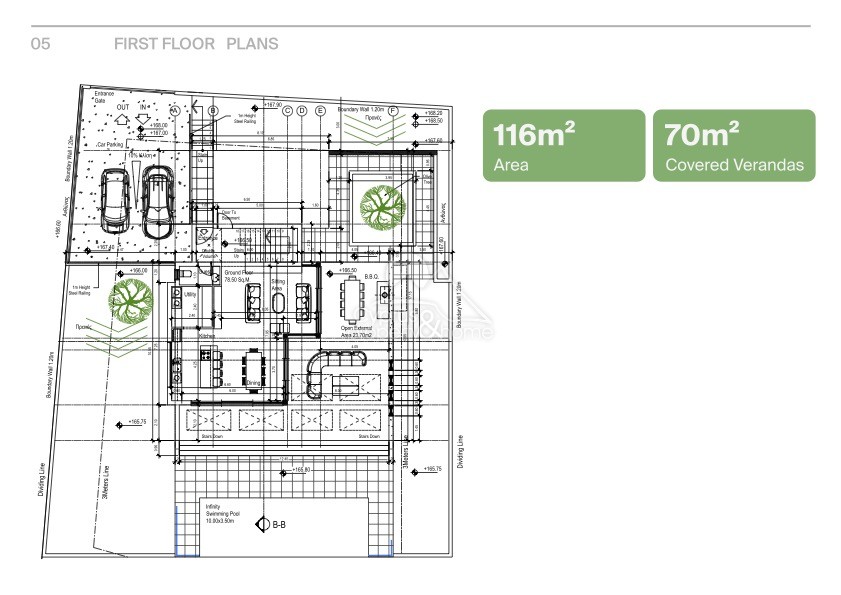 Dining and living areas open onto ample seating spaces and a barbecue area for alfresco dining