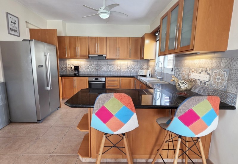 Set on a generous 800m² plot, the landscaped garden is gravelled and irrigated, featuring mature trees, fruit trees, and colourful shrubs. Two pathways wind through the garden, leading to delightful seating and dining areas, including a charming wooden pergola ideal for alfresco meals. Another seating spot captures beautiful unobstructed sea views—an idyllic place to enjoy your morning coffee or take in the spectacular Paphos sunsets.