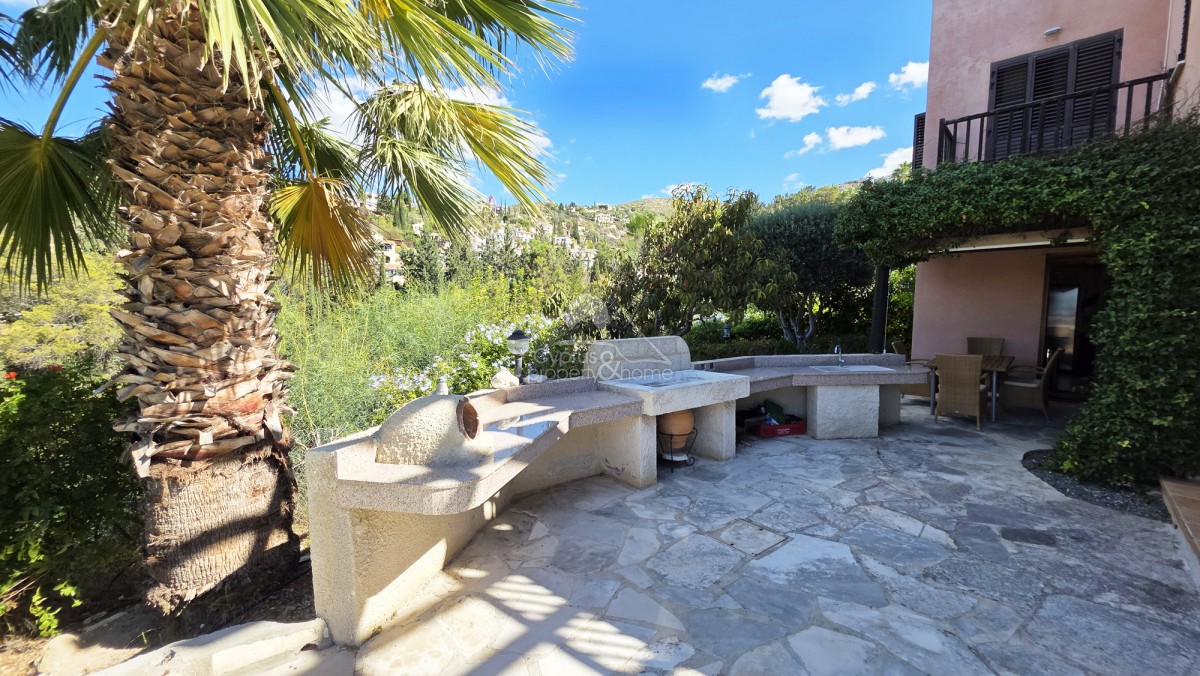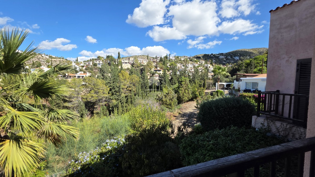 Upstairs, the master suite is a private haven of comfort, featuring an en-suite bathroom, a full wall of built-in wardrobes, and access to a large balcony overlooking the swimming pool and across the ravine to the sea. The second bedroom is generously proportioned, while the third bedroom enjoys hillside and sea views, built-in wardrobes, and its own private balcony. A family bathroom serves the additional bedrooms.