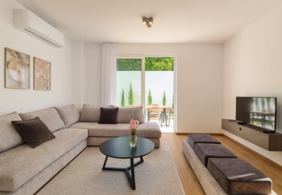 The villa has been thoughtfully arranged over two levels to suit modern living. The ground floor features a light-filled open-plan kitchen, dining and living area that opens onto the outdoor terrace, creating an easy flow between inside and out. This level also includes a bedroom, ideal for guests, family members or a home office, along with a guest WC. Upstairs, two further bedrooms provide comfortable accommodation, served by a well-appointed bathroom, making the layout practical as well as stylish.